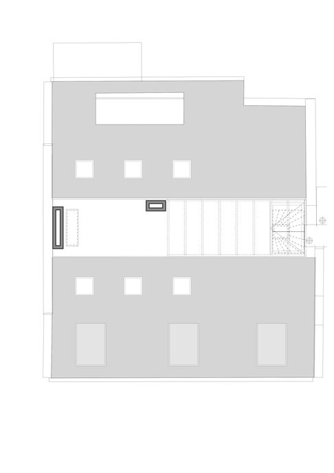 Die neuerliche Renovation behält den durchgehenden Wohnraum bei und ergänzt ihn um einen hofseitigen Balkon. Die mittig gesetzte Küche teilt den grossen Raum nutzungsmässig wieder in zwei Bereiche auf. Anstelle von Küche/Bad werden rückwärtig zwei Badezimmer geschaffen.