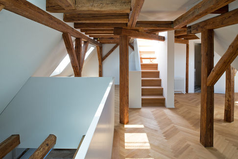 Alle neuen Elemente im Gebäude wurden in der Materialisierung ähnlich ausgeführt wie der Bestand; Türen als gestemmte Flügeltüren, Holzfenster mit öffenbarem Oberlicht, aussenliegender Sonnenschutz mit Zuggurt. Neu geschaffene Räume wie der Liftvorraum nehmen Bezug zum Bestand über die Farbauswahl. Das Lichtkonzept sowie die aneinander gegliederten Räume mit überlaufenden Fischgratparkett erinnern an die Entstehungszeit des Baus.